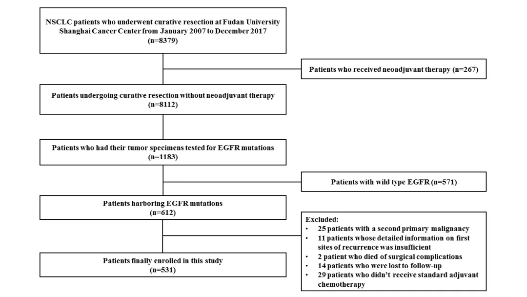 来自复旦大学上海癌症中心放射治疗科朱正飞团队进行了一项回顾性研究,该研究回顾性分析了2007年1月至2017年12月在复旦大学上海癌症中心接受手术切除治疗并对其术后样本进行了EGFR突变检测的NSCLC患者的临床病历资料。1183例行完整手术切除并接受符合NCCN指南推荐的标准辅助化疗的NSCLC患者术后组织进行EGFR突变检测,值得注意的是,这1183名EGFR突变检测患者的基线疾病特征(包括年龄,性别,TNM分期和肿瘤组织学特征等)和在同一时期内接受根治性NSCLC切除的整体人群是均衡的。最终,有531例EGFR突变NSCLC患者被纳入此研究中。筛选过程如下述流程图所示。