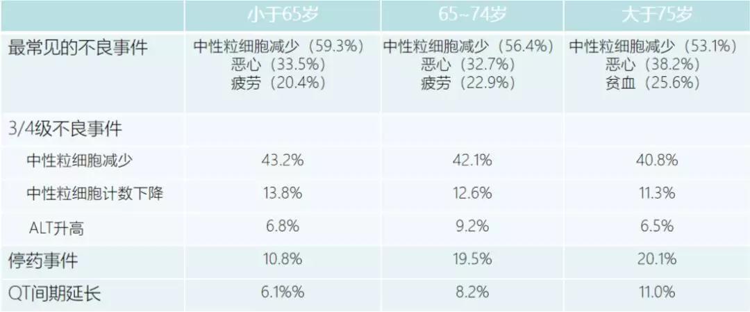 Michelino L.报道[3]了不同年龄亚组的疗效和安全性结果。在3246例患者中,小于65岁、65~74岁和大于75岁亚组患者分别有2173例、764例和309例。不良事件发生见下表。各亚组患者进展时间均为达到。三组患者预计9个月无事件概率分别为76.0%(95%CI,73.7-78.2)、81.7%(95%CI,77.9-84.9)和86.2%(95%CI,80.1-90.5);总有效率分别为21.4%(95%CI,19.6-23.1)、17.1%(95%CI,14.5-20.0)和22.3%(95%CI,17.8-27.4);临床受益率分别为67.4%(95%CI,65.4-69.4)、63.0%(95%CI,59.4-66.4)和64.4%(95%CI,58.8-69.7)。