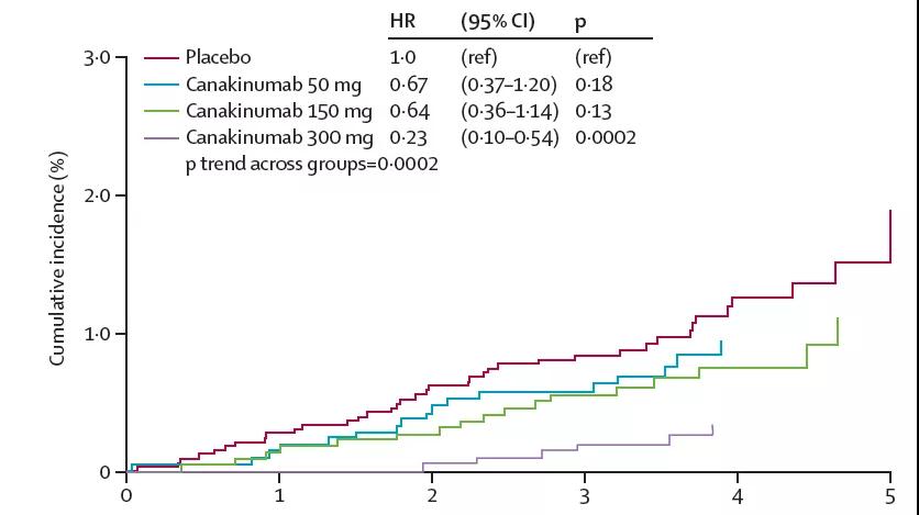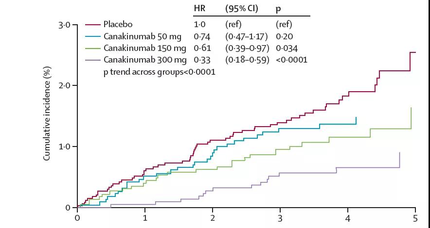CANTOS研究是一项III期临床研究,研究对象为患有心肌梗死、高敏C反应蛋白(hsCRP)水平≥2mg/L且之前没有被诊断为癌症的患者,样本量高达10061例,探索了不同剂量组ACZ885(50mg,150mg,300mg,每3个月皮下注射)比较安慰剂组应用3到5年后的心血管事件风险。研究持续进行了六年,随访中值为3.7年。研究结果达到了主要终点,ACZ885与标准治疗组合使用时,可减少心血管死亡、非致死性心肌梗死和非致命性中风的复合心血管事件风险。
