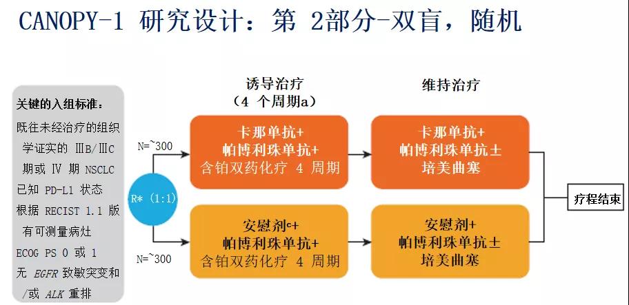 目前,对于驱动基因阴性的晚期NSCLC,免疫治疗已成为一线治疗中不可或缺的部分。基于CANTOS研究中ACZ885降低肺癌发生及死亡风险的优异表现,帕博利珠单抗+含铂化疗,联合或不联合ACZ885一线治疗局部晚期或转移性非小细胞肺癌(NSCLC)的随机、对照、国际多中心III期研究研究正在进行中,研究对象为局部晚期IIIB/IIIC(不适用于根治性化放疗)或IV期(转移性)NSCLC患者,评估在4个周期的ACZ885 vs. 安慰剂联合帕博利珠单抗+含铂化疗之后,在总疗效达到疾病稳定或更佳结果的受试者中继续给予维持治疗的疗效和安全性。在随机、对照部分之前将有一个安全性导入部分,其中将确认使用ACZ885联合帕博利珠单抗及以铂类为基础的双联化疗的推荐剂量。该研究拟纳入全球600例患者,其中将入组中国患者60例,由吉林省肿瘤医院程颖教授作为Leading PI。