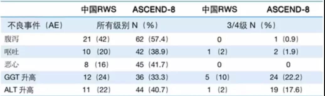 此外,RWS中的胃肠道AE较ASCEND-8研究塞瑞替尼450 mg随餐治疗组和ASCEND-4研究750 mg空腹治疗组均有显著的减少,呕吐和恶心较ASCEND-8研究约减少了1倍,较ASCEND-4研究减少了2倍。RWS中谷氨酰转肽酶(GGT)升高的比例为24%,谷丙转氨酶(ALT)升高的比例为22%,ASCEND-8研究中分别为33.3%和40.7%,也都有明显的下降。