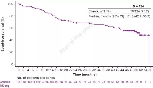 从2013年1月至2014年1月,共有来自16个国家、41个研究中心的共计124例患者入组,其中接近60%为亚裔患者,92.7%的患者PS评分≤1分,39.5%的患者基线存在脑转移,98.4%的患者既往接受过抗肿瘤治疗。数据截止时,患者的中位随访时间为52.1个月(范围:48.4-60.1个月)。