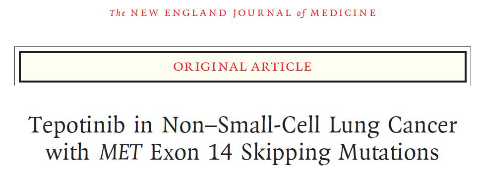 在前期临床研究中,Tepotinib显示了针对METex14+突变的较好疗效。摘要号为9556的研究公布了初步结果。令人惊讶的是,这项仅仅被大会接收为壁报展示的文章,力压众多口头汇报和讨论,同步发表于殿堂级期刊——《新英格兰医学期刊》 (后续整理均基于发表于新英格兰医学杂志的最新数据整理而成)。