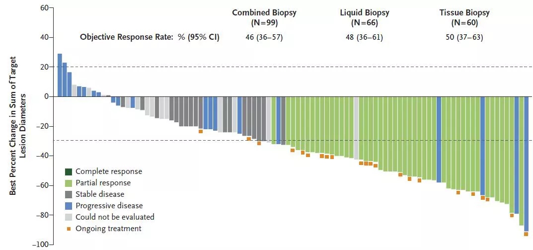 结果发现,独立评审委员会评估的ORR为46%,研究者评估的ORR为56%,基于组织和外周血检测的评估结果不存在较大差异。独立评审委员会评估的结果和研究者评估的结果,分别有89%和88%的患者出现肿瘤缩小,多数患者在接受治疗后6周以内出现。