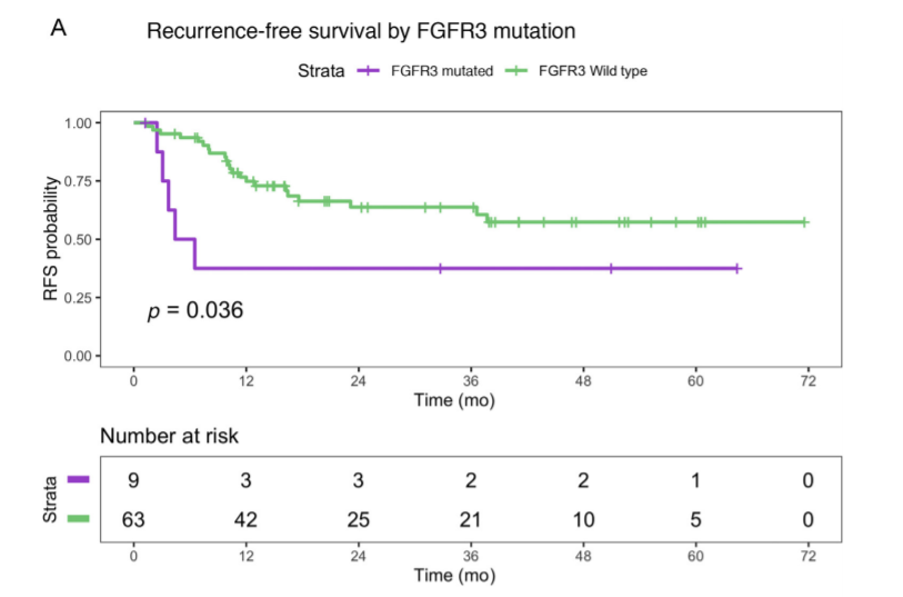 结果显示:72例新辅助治疗(NAC)队列患者中有9例(13%)存在FGFR3突变,且这9例患者均未达到病理完全缓解(pCR),3例有残存的非MIBC(原位癌,n=1;pT1,n=2)。FGFR3突变与较短的RFS相关(HR:2.74;P=0.036),但与OS无关。