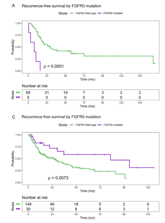 在TCGA队列中,接受辅助化疗的患者(n=74),FGFR3突变型患者的RFS也较短(下图A)。相反,在未接受围术期化疗的患者(n=179),FGFR3突变型患者与较长的RFS(下图C)和OS相关。