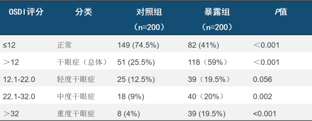 表1. 根据OSDI评分暴露组和对照组的干眼症患病率