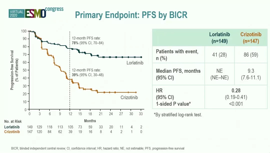 研究结果显示,与克唑替尼相比,Lorlatinib显著改善PFS(中位,不可估计vs. 9.3个月;HR=0.28);1年PFS率为78% (95% CI: 70-84) vs. 39%(95% CI: 30-48)。研究者评估的PFS也显示了Lorlatinib的获益(不可估计vs. 9.1个月;HR=0.21;95%CI: 0.14-0.31)。1年PFS率为80% (95% CI: 73-86) vs. 35% (95% CI: 27-43)。研究组的PFS获益趋势在所有预先设定的亚组中一致。在有脑转移的患者中,PFS的HR为0.2,在没有脑转移的患者中PFS的HR为0.32,。