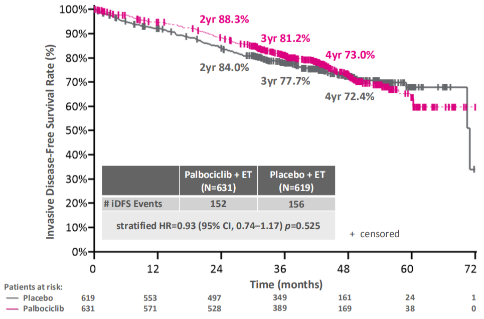 该研究的iDFS终点之前经过两次期中分析,第一次期中分析中重新校正了样本量和事件数。第二次期中分析是有效-无效性分析,这次是最终分析。在最终分析中,该研究设定了一个名义上的疗效界值P<0.0463,但研究结果显示,没有达到pCR的有高危复发风险(如CPS-EG评分≥3或2伴有淋巴结残留阳性)病人的iDFS,在最终一次随访过程当中(中位随访时间42.8个月),Palbociclib强化组仍然没有达到统计学差异,P值为0.525。