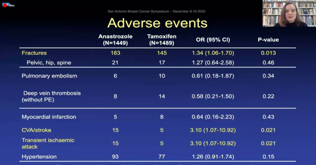 经过将近12年的随访,同样也看到了在一些其他特征上的差别,如非乳腺癌的肿瘤发生,包括子宫内膜癌、卵巢癌等,阿那曲唑组更少。但是阿那曲唑组的骨折发生率和短暂性脑缺血发作(TIA)/卒中却更高。