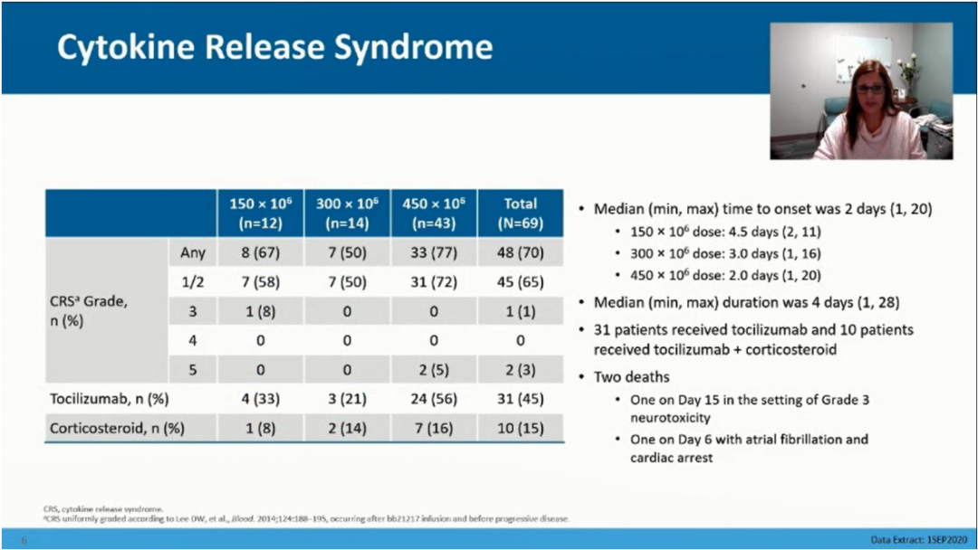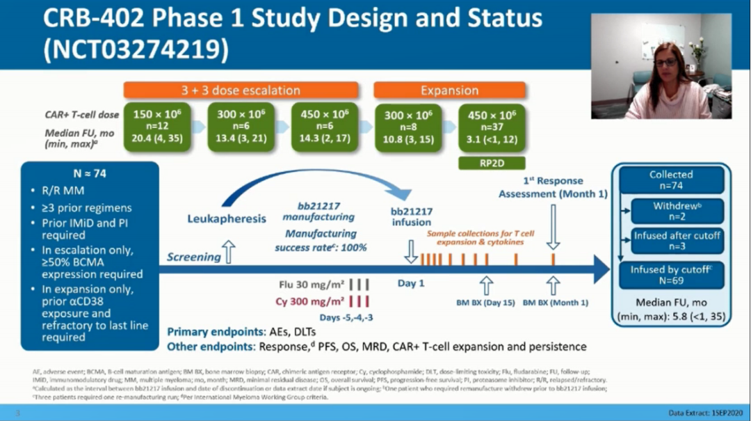 CRB-401(NCT02658929)是一项包括剂量递增和扩展的I期临床研究。扩展阶段入组病人需满足以下条件:既往接受过至少三线包括蛋白酶体抑制剂、免疫调节剂和抗CD38抗体在内的治疗,且对最后一线耐药。剂量递增阶段的合格标准详见(Raje et al. N Engl J Med. 2019; 380: 1726)。病人先进行氟达拉滨(30 mg/m2)和环磷酰胺(300 mg/m2)×3天淋巴细胞剔除的预处理,在休息2天后接受剂量递增阶段目标剂量在50 ×106 , 150 × 106 , 450 ×106 , 或 800 ×106 CAR-T细胞的ide-cel治疗以及剂量扩展阶段150-450× 106剂量 CAR- T细胞的ide-cel治疗。研究主要终点是安全性,根据国际骨髓瘤工作组标准,次要终点包括治疗反应,探索性终点包括无进展生存期(PFS)、总生存率(OS)和最小残留疾病(MRD)。