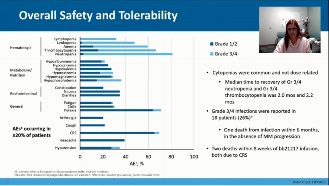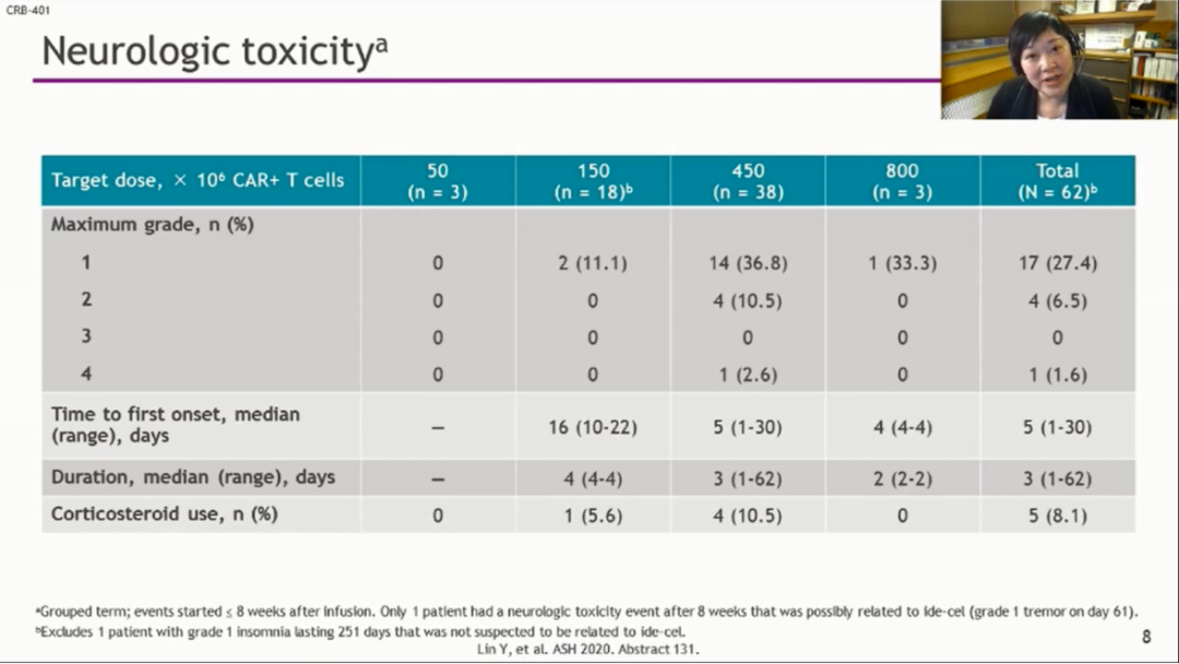 ide-cel是一种抗BCMA CAR-T细胞治疗,在第一次应用在人类中的I期CRB-401临床研究(Raje et al. N Engl J Med. 2019; 380: 1726) 和关键的II期KarMMa临床研究 (Munshi et al. J Clin Oncol. 2020;38[suppl, abstr]:8503)中治疗复发难治性多发性骨髓瘤(RRMM)病人,显示出其良好的耐受性和巨大的治疗潜力。ide-cel展现出良好的风险-收益比,表现为总反应率(ORR)达85%,完全缓解率达45%,以及在CRB-401临床研究中第一批33例治疗病人的中位无进展生存期为11.8月。这里我们将汇报正在进行的CRB-401临床研究中接受ide-cel治疗的62例病人的有效性和安全性的更新数据。