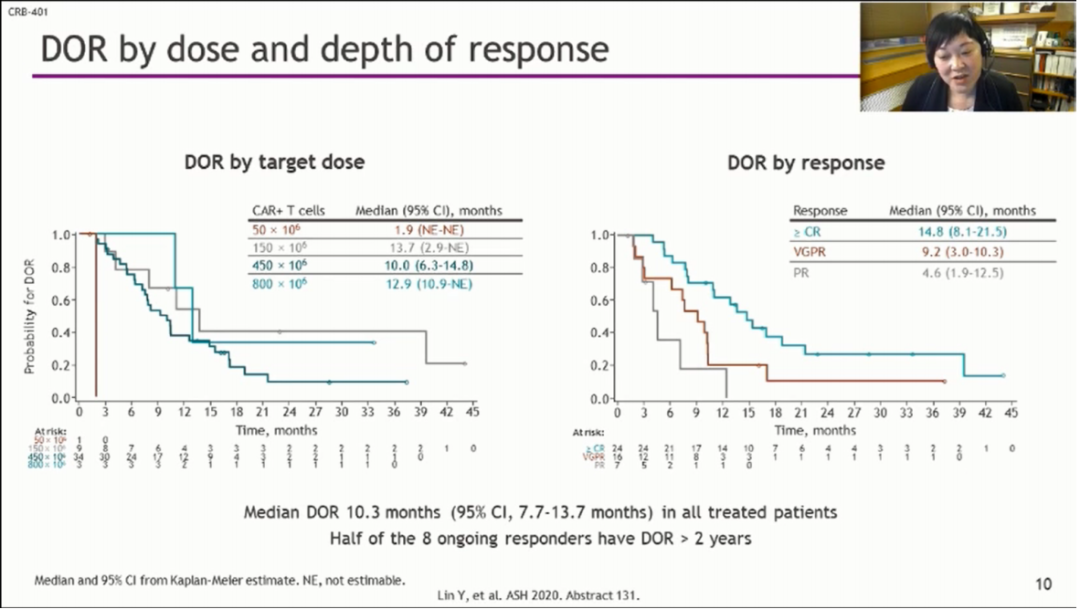 有效性方面:在剂量递增和剂量扩展阶段的62名病人中总反应率为76%,包括24例(39%)CR或更好,40例(65%)VGPR或更好。中位缓解持续时间(DOR)为10.3月。在37例有反应的病人中进行最小残留疾病(MRD)检测,其中30例在1个或更多的时间点MRD阴性(≤10-4 有核细胞),其他7例均为MRD阳性。在剂量递增和剂量扩展阶段的所有病人中位随访时间为14.7月中,中位PFS为8.8月,中位OS为34.2月。综上所述,我们观察治疗反应和生存结局与剂量呈正相关,并且在≥150 ×106CAR+ T细胞剂量时疗效更好。