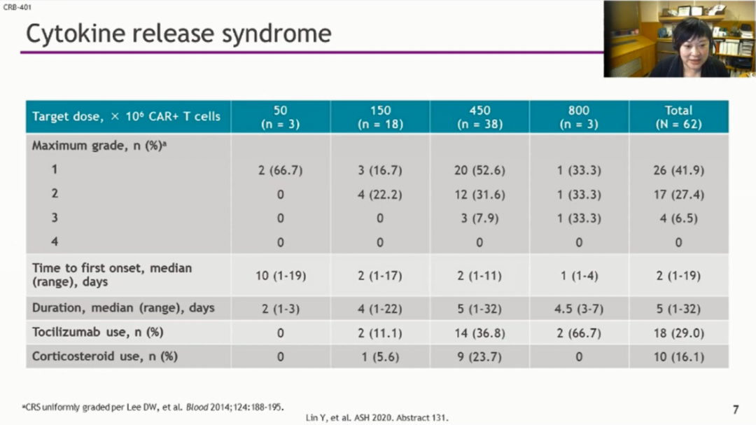 安全性方面:①31/46(67%)的病人发生细胞因子释放综合征(CRS),包括1例死亡病例(14例1级,15例2级,1例3级以及1例5级),距离第一次发作的中位时间是3(1-20)天,并且应用托珠单抗(18例)+/-糖皮质激素(6例)治疗CRS。