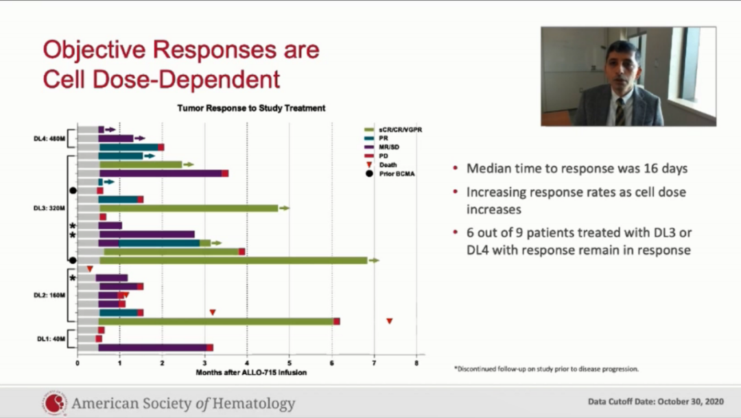 这些早期数据提示ALLO-715和ALLO-647有着可控的安全性。ALLO-715在复发难治性多发性骨髓瘤患者(R/RMM)的同种异体治疗表现出一定的临床有效性,并且临床效果与细胞剂量呈正相关。