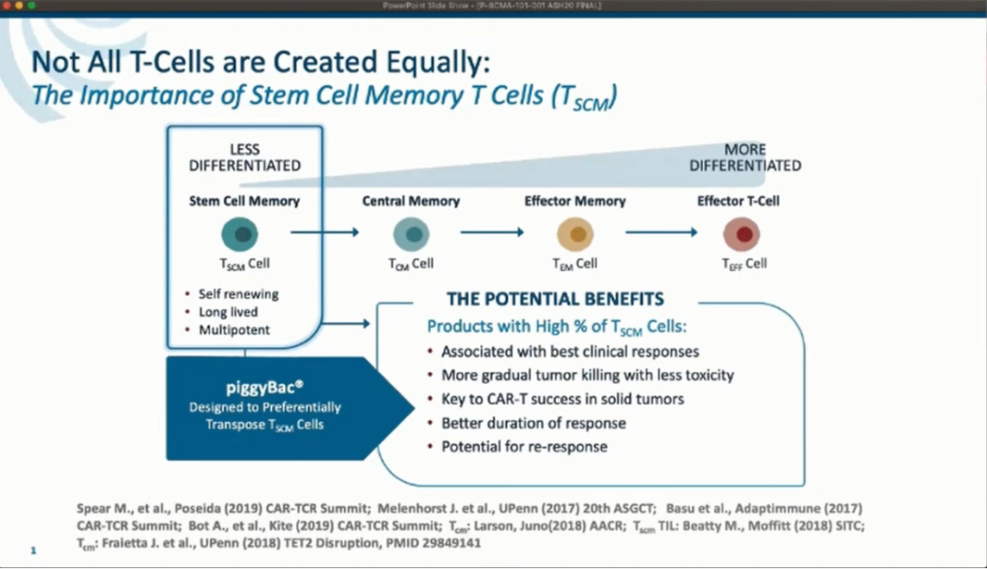P-BCMA-101是一种以BCMA为靶点的自体嵌合抗原受体T细胞(CAR-T),由高比例的高品质干性记忆性T细胞组成。P-BCMA-101是使用一种新的基于转座子的系统piggyBac(编者注:在我们研究某种疾病的发病机制或者某种药物的作用靶点时,经常需要建立目的基因过表达或基因敲除的细胞模型,目前构建稳转细胞株及部分敲除细胞株最常用的方式之一是慢病毒法,慢病毒因其可以转染几乎所有种类的细胞,且在转染后可以整合到细胞的基因组而长期表达的优势,是目前较为主流的构建方法,但慢病毒构建的稳转细胞株相对于野生型没有生长优势;此外,慢病毒对目的基因的载量也有限。因此,寻找一种高效简便可替代慢病毒法的方法显得尤为重要。转座子的出现为构建基因编辑细胞株提供了一个全新的视野。转座子也被称为跳跃基因,由Barbara McClintock教授在上世纪50年代发现,并于1983年因此发现而获得诺贝尔医学奖,是指一段DNA序列由基因组的一个位置跳跃到另一个位置。)制造的,旨在提高疗效的同时将毒性降至最低。研究中改进可生产工艺和给药方案的确带来了更好的安全性和更高的疗效。P-BCMA-101显著提高了疗效和安全性上,更加便利了MM的治疗,且便于门诊输注,在未来的临床应用上前景广阔。