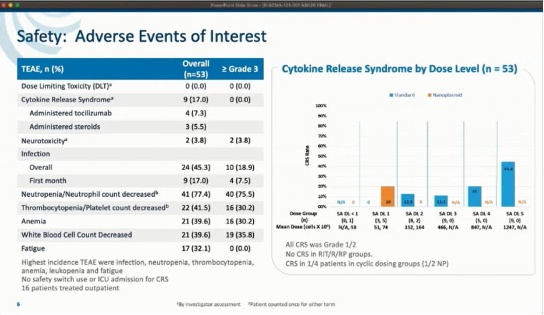 有效率方面:①34名患者在初始剂量增加期间单次给药的总有效率(ORR)为57%。我们没有观察到明确的剂量反应曲线,但发现在较低剂量下有更好的反应,因此我们使用改进的生产工艺对额外的队列进行研究,重点关注采用目前剂量范围的最低剂量的效果。