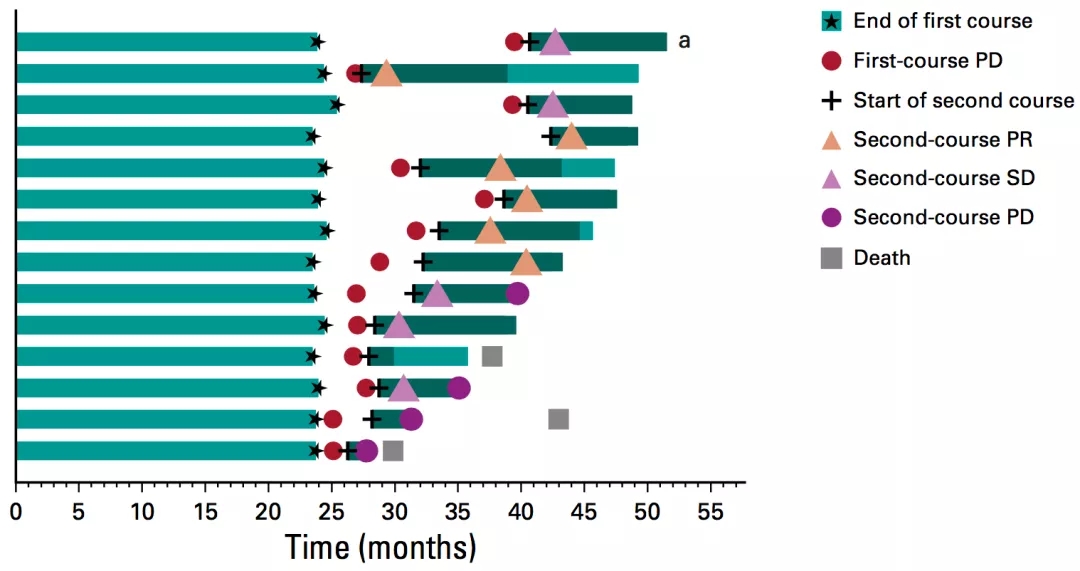KEYNOTE-010研究在随访中发现,有14例曾接受过帕博利珠单抗治疗进展的患者再次接受该药治疗,近半数(6例,43%)仍能获得疾病缓解,5例(36%)达疾病稳定,研究截止时11例患者仍然存活,并未发现新的不良事件类型。这一数据提示帕博利珠单抗再次应用能使8成患者获疾病稳定,近5成患者达疾病缓解,并不需要特殊考虑安全性问题,为临床上免疫治疗的反复使用提供理论依据,也拉开了免疫治疗再挑战的序幕!