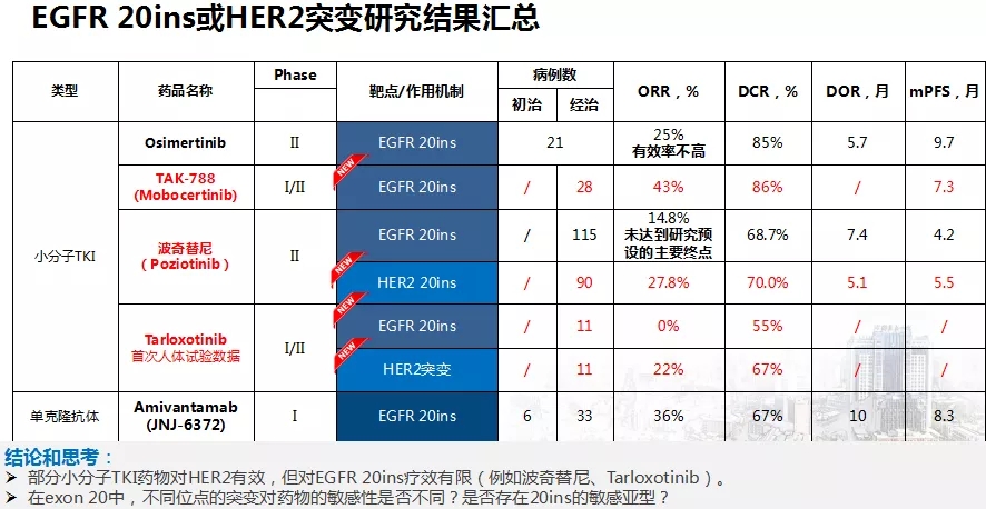 EGFR exon 20ins(EGFR外显子 20插入)突变是最常见的EGFR罕见突变。2019 ASCO报道显示EGFR和cMET双特异性抗体JNJ-372在EGFR 外显子20插入突变肺癌中有一定疗效。TAK-788是一种口服EGFR / HER2抑制剂,今年更新了研究数据。