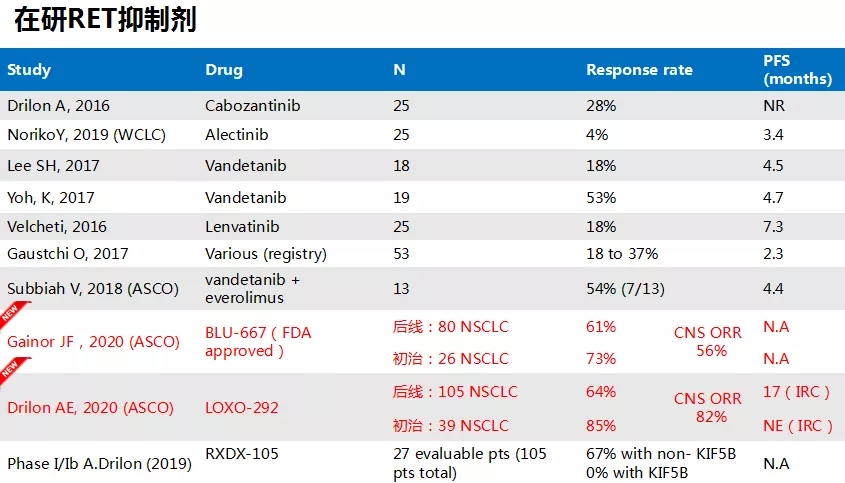 LOXO-292治疗RET重排NSCLC:2020年8月,I/II期LIBRETTO-001研究发表于NEJM:Selpercatinib在既往接受含铂化疗和初治RET融合阳性NSCLC患者中的ORR分别为64%和85%。13