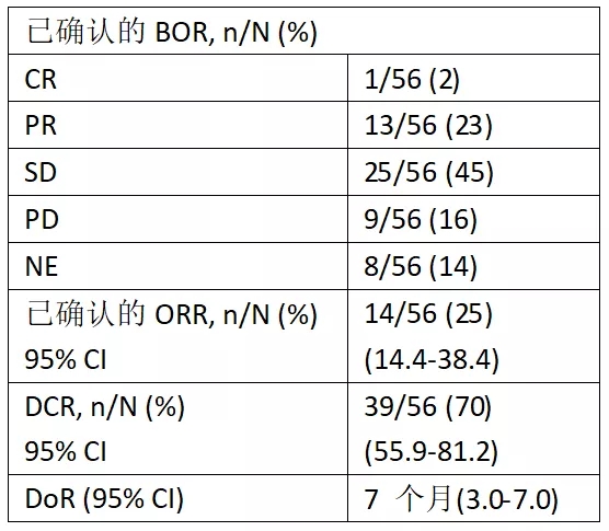 中位治疗时间为3.5个月(1-14);中位随访时间为5.4个月(0.3-15)。56例患者可评估治疗反应,疗效如下表所示,另外3例患者有部分反应待确认。