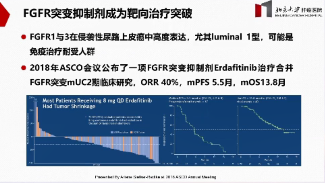 在免疫治疗的选择中,一方面可以基于临床病理特征,比如一般情况好的、肿瘤负荷轻的、淋巴结转移/非转移人群可能获益会更多一些;另外有一些标志物也在摸索中,比如对于EGFR突变的病人,免疫治疗可能并不是首选。近年来,厄达替尼等FGFR突变抑制剂为此类人群提供了新的靶向治疗选择。此外,关于尿路上皮癌超进展(HPD)方面的一些指标(比如MDM2/4扩增、EGFR突变),这些指标的发现可能对我们人群选择有一定的帮助,当然生物标志指标的探索也在不断地发展中。