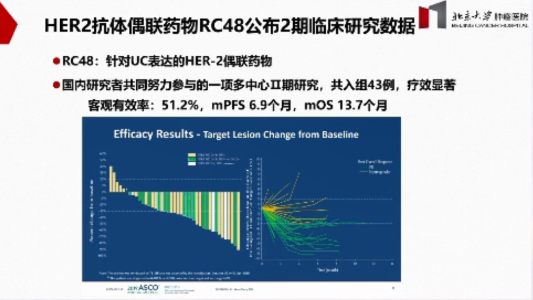 国内方面,针对HER2高表达的抗体偶联药物RC48-ADC也在临床研究中。在郭军教授的带领下,相关的研究也走在了国际前沿。这项RC48-ADC的Ⅱ期研究也取得了不错的结果,预计今年会在国内上市,也将成为全世界第一个用于尿路上皮癌HER2表达的抗体偶联药物。