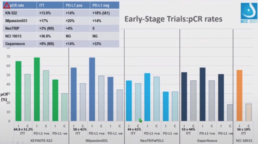 刘强教授对此表示认同,免疫治疗在早期和晚期TNBC的治疗中表现并不一致,IMpassion130、KEYNOTE355研究证实晚期PD-L1阳性患者OS/PFS获益明显,而在早期患者中KEYNOTE 522、IMpassion031研究中免疫治疗取得的PCR率的提高并不依赖于PD-L1的表达,也还没有转化成EFS或DFS明确的获益。相信免疫治疗会是早期TNBC强有力的武器,但这个武器应该用于哪些患者?什么时候用?怎么用?都还没有答案。尤其是在免疫治疗有可能给患者带来一些终身的副作用情况下,仍需要更多的证据支持。目前,中山大学孙逸仙乳腺肿瘤医院正在开展的一项多中心的研究,利用ctDNA筛选高危早期TNBC患者,予以免疫治疗升阶梯,初步数据非常不错,期待该研究能为免疫治疗在TNBC的个体化、精准化应用提供指导。
