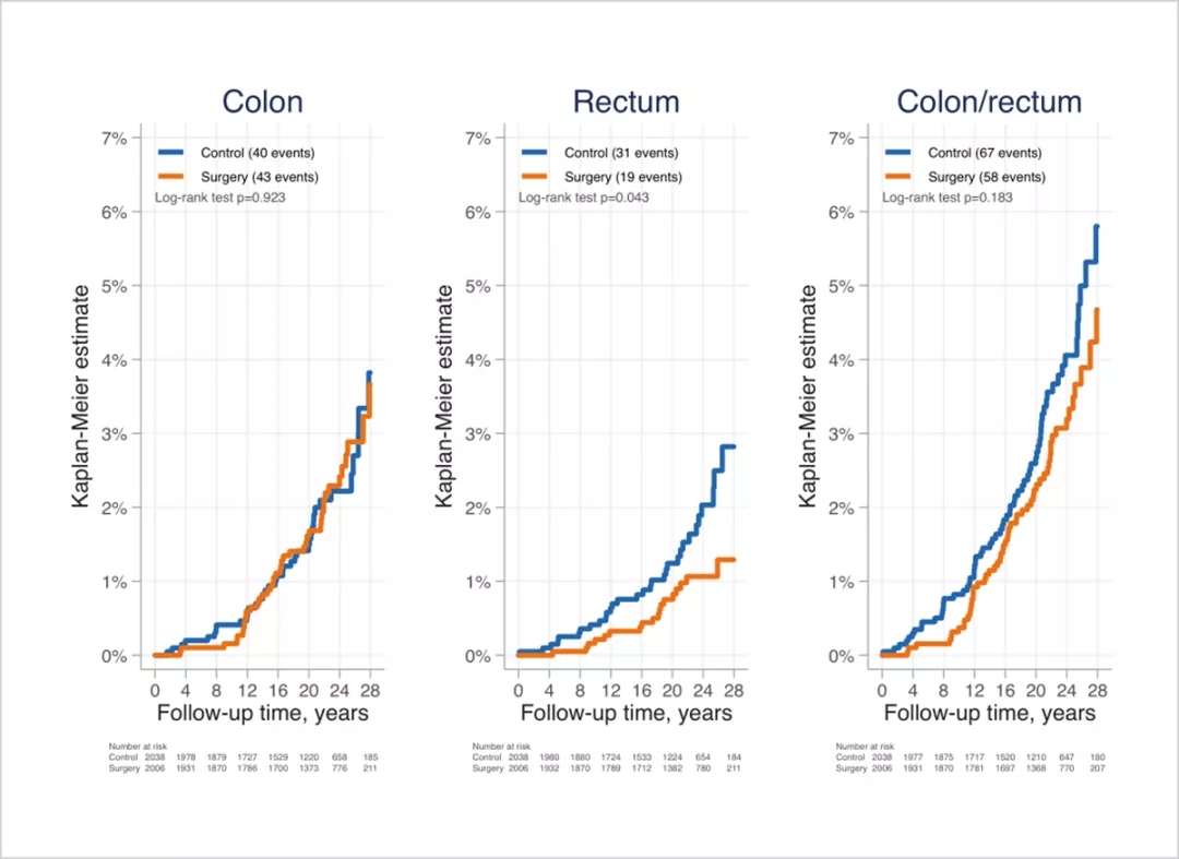 研究中位随访时间超过22年。在这段时间内,手术组的体重显著下降,而对照组的体重基本保持不变。随访期间,手术组结直肠癌58例,对照组67例,风险比(HR)为0.79(95%CI:0.55~1.12;P=0.183)。校正年龄、体质指数、酒精摄入量、吸烟状况和糖尿病后,校正后的HR为0.89(95%CI:0.62~1.29;P=0.551)。当单独分析直肠癌事件时,手术组有19例直肠癌,对照组有31例直肠癌,研究人员观察到手术后直肠癌风险降低(HR=0.56;95%CI:0.32~0.99;P=0.045),校正后的HR=0.61(95%CI:0.34~1.10;P=0.099),而患结肠癌的风险没有变化(图1)。总体而言,该项长期前瞻性研究显示,减肥手术与结直肠癌风险的变化无关。