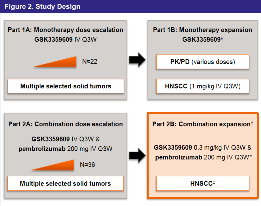 该研究是GSK公司研发的一种诱导性T细胞共刺激因子(ICOS)激动剂GSK3359609单药或者联合帕博利珠单抗在多瘤种中的尝试。
