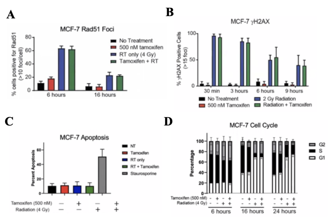 对激素受体阳性且具有放疗指征的术后乳腺癌患者,内分泌治疗和放射治疗都是降低患者复发并延长生存的重要措施。然而迄今为止,内分泌治疗和放射治疗的同步使用的效应是未知的。本研究通过体内外实验证实内分泌治疗药物他莫昔芬可增加ER+乳腺癌的放疗敏感性,并且发现他莫昔芬并不影响乳腺癌细胞DNA损伤同源重组修复、细胞凋亡及细胞周期。但是,他莫昔芬可导致NHEJ介导的修复减少。