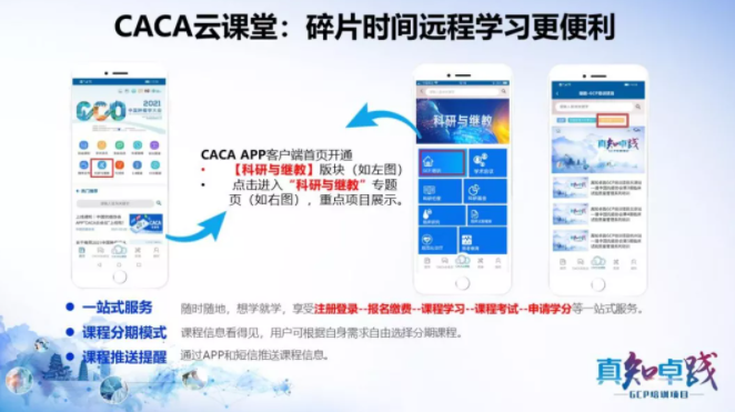 中国抗癌协会阎昭教授介绍了真知卓践项目的年度规划。项目内容包括两大板块:“真知”——GCP理论培训,和“卓践”——GCP名院沙龙。2021年,计划开展12场GCP理论培训,邀请全国知名GCP专家授课,由中国抗癌协会(CACA)授予国家级继续教育学分,颁发GCP培训合格证书;4场GCP名院沙龙,旨在充分发挥一线城市GCP中心的示范效应,组织医院团队进行参访交流。理论培训课程将通过CACA APP云课堂线上呈现,便于学员利用碎片时间远程学习(图1)。
