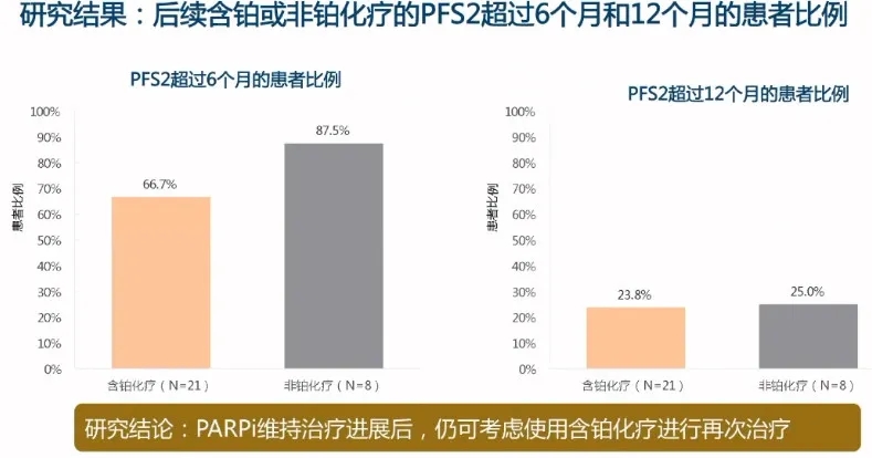 PARP抑制剂耐药后化疗:PARP抑制剂耐药后的患者对含铂或非铂化疗均有应答,PFS2在含铂及非铂化疗方案之间无显著差异。PARP抑制剂维持治疗进展后,仍可考虑使用含铂化疗进行再次治疗。
