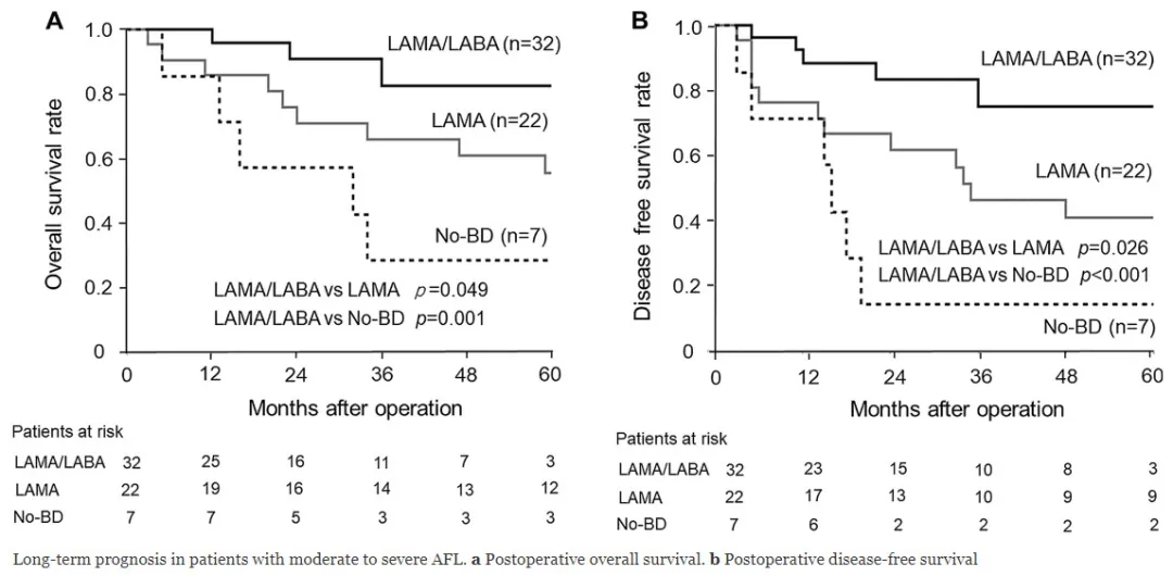在61名中度和重度气流受限(AFL)的患者中,与仅接受LAMA治疗或仅接受康复护理的患者相比,接受LAMA/LABA治疗的患者的总生存期(P=0.049和P=0.001)和无疾病生存期(P=0.026和P<0.001)更长。