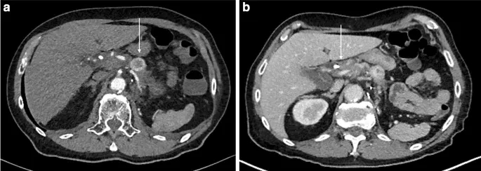 在进行肿瘤分期时,腹部超声、计算机断层扫描(CT)和胸部x线显示PDAC没有远处转移。CT扫描发现胰腺多发占位性肿块(图1)。由于放射学怀疑存在门静脉和可能的腹腔干紧邻动脉浸润,PDAC被划分为边缘可切除。