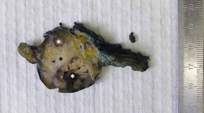 可见两个明确的RCC转移灶(白色星号),以及介于两者之间的白黄色PDAC(黑色星号)。轴向切片技术用于胰头(未显示),胰体和胰尾平行于胰颈边缘切片(图片引自发表文章)