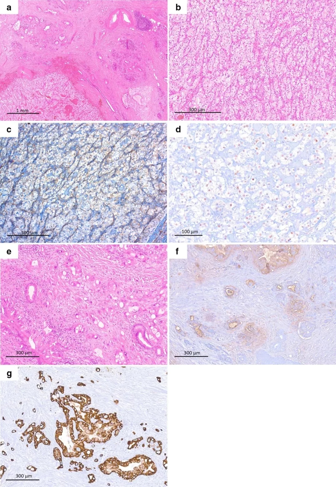 镜下检查发现,胰腺体/尾部由不同组织学形态的肿瘤细胞形成(图3a)。两个界限明确的肿瘤具有相同的组织形态,肿瘤细胞呈均匀的结节状生长,胞浆透明,细胞核小(图3b)。免疫组化后,肿瘤细胞vimentin和Pax-8阳性(图3c、d),而CK7和Ca19-9阴性,因此诊断为ccRCC转移。更大的、界限不清的肿瘤延伸至胰腺尾部,其组织形态更不均匀。而一些区域显示小到中等大小的不规则管状腺体,嵌在增生的间质中,其他区域显示筛状到实体生长的模式,其肿瘤细胞具有明显的嗜酸性胞浆,有时含有胞浆空泡和高度多形性增大的核(图3e)。