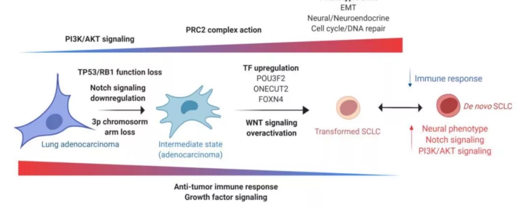 Cancer Discov最近一项研究应用多组学究研方法发现,与de novo SCLC相比,转化性SCLC的肿瘤微环境近似“冷肿瘤”,会抑制抗肿瘤免疫激活,包括细胞因子信号传导、T 细胞免疫和中性粒细胞介导的免疫激活。