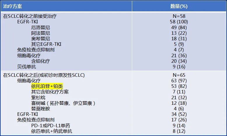 在2019年J Clin Oncol刊登的针对67例SCLC患者的回顾性分析中,NSCLC向SCLC转化后或初诊时SCLC患者接受了两个线数的全身治疗,铂类-依托泊苷(EP)是最常用的方案(n=53)。在临床结局方面,总体人群的总生存为31.5个月,转化性SCLC人群的总生存仅10.9个月,EP方案的临床缓解率为54%;接受免疫治疗的17例患者未显示疗效。