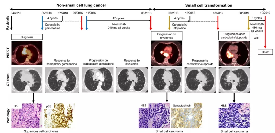 2020年J Immunother Cancer刊登了一则病例报告,一位60岁、有吸烟史(35年支)的IV期肺鳞癌女性患者,接受吉西他滨+顺铂化疗4周期后PR,4个月后疾病进展(PD),转换纳武利尤单抗治疗21个月后PD,再次活检病理为SCLC,给予EC方案化疗,疗效达几乎CR,14个月后PD,再次活检病理为SCLC。