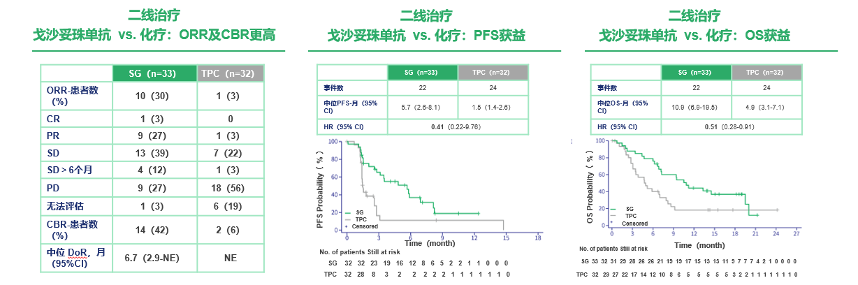 2021年ASCO报道的ASCENT研究二线亚组分析,即(新)辅助化疗后12个月内发生复发进展并接受一种转移性疾病治疗方案的患者,接受戈沙妥珠单抗治疗的ORR(30% vs 3%)、PFS(HR 0.41)和OS(HR 0.51)均较化疗有显著改善。