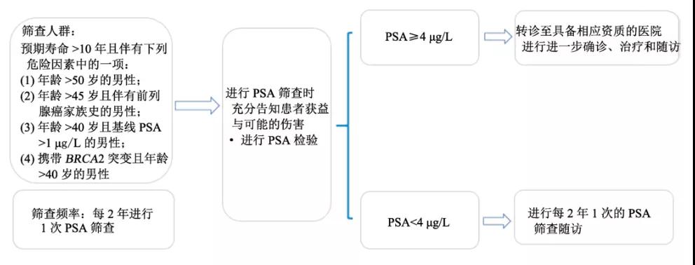 2017年,中国抗癌协会泌尿男生殖系统肿瘤专业委员会(CACA-GU)前列腺癌学组发布了第一部《前列腺癌筛查中国专家共识》,该共识首次明确了适用于中国前列腺癌筛查的高危人群及筛查间隔,推进了我国前列腺癌筛查工作的进程。