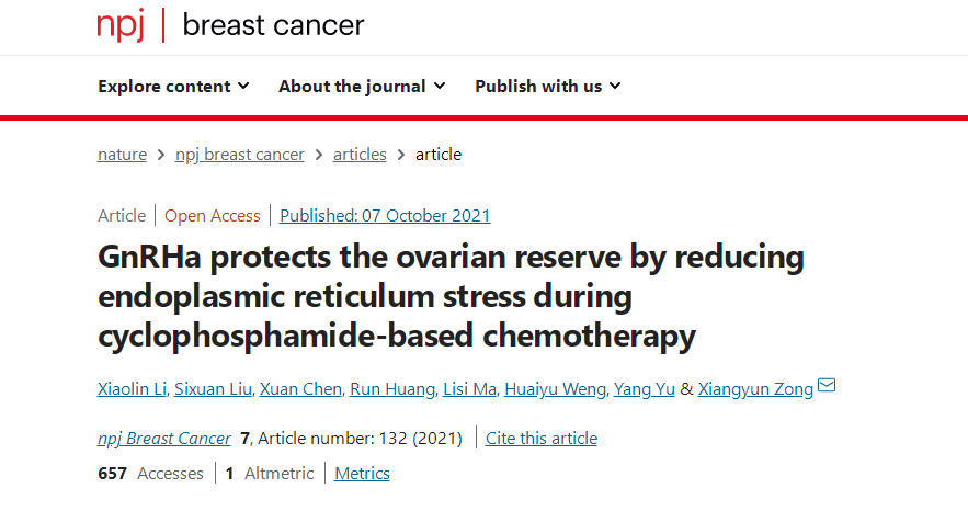 继2021年9月16日宗祥云教授团队的EGOFACT研究在2021 ESMO大会上进行壁报展示后,10月7日团队的配对实验室研究“GnRHa通过缓解内质网应激保护暴露于环磷酰胺化疗毒性下的卵巢储备功能”正式发表于Nature子刊npj Breast Cancer(https://doi.org/10.1038/s41523-021-00340-7)。现将研究内容进行介绍。
