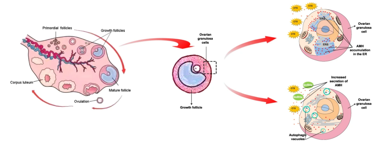 该研究首次明确提出了GnRHa在乳腺癌化疗患者保护卵巢功能的直接作用机制,指出:环磷酰胺导致卵巢颗粒细胞内质网应激,进而导致AMH在胞内蓄积、抑制其分泌,血清AMH水平降低导致原始卵泡池向生长卵泡大量募集、发育并进一步受损,致使卵巢储备降低;联用GnRHa可以通过抑制mTOR pathway诱导自噬,缓解内质网应激,促进蓄积在颗粒细胞胞内的AMH向细胞外释放;外泌的AMH发挥其保护卵巢储备的正常功能,降低化疗引起的卵巢功能损伤、预防卵巢功能不全(POI)的发生。