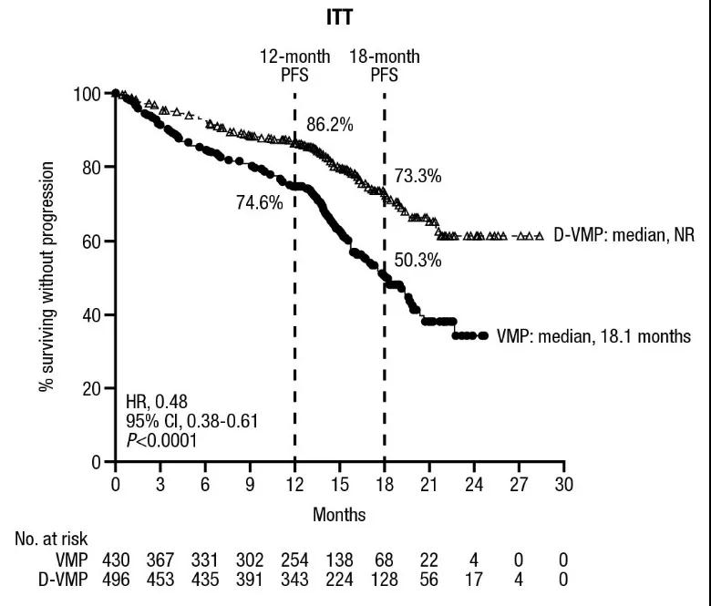OCTANS组和ALCYONE组的平均随访时间分别为12.3个月和16.5个月,OCTANS组和ALCYONE组的合并意向治疗(ITT)人群中,D-VMP组(n=496)的12个月PFS估计率为86.2%,VMP组(n=430)为74.6%,18个月PFS估计率分别为73.3%和50.3%;D-VMP组的PFS中位数为NR,而VMP组为18.1个月(HR,0.48;95%CI,0.38-0.61;P<0.0001,图1)。