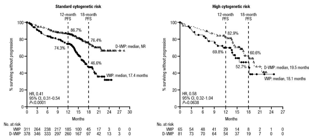 在具有标准细胞遗传学风险的患者合并亚组中,D-VMP组(n=378)的12个月PFS估计值为86.7%,VMP组(n=311)为74.3%,18个月PFS估计值分别为76.4%和46.6%;D-VMP组的PFS中位数为NR,VMP组为17.4个月(HR,0.41;95%CI,0.31-0.54;P<0.0001,图2)。