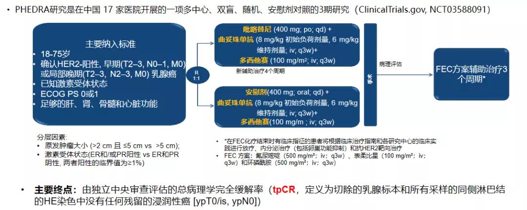 PHEDRA研究是一项旨在评估吡咯替尼或安慰剂+曲妥珠单抗+多西他赛用于HER2阳性乳腺癌新辅助治疗的Ⅲ期试验。研究设计及患者基线特征如下图所示。