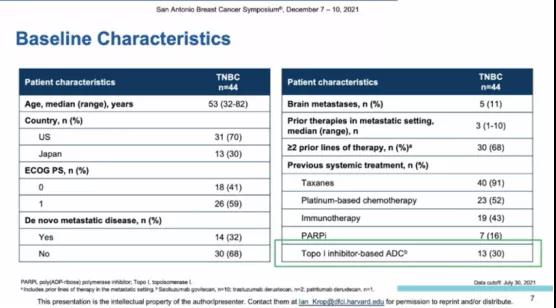 ■ 研究背景:Datopotamab-deruxtecan(Dato DXd)是一种抗体-药物结合物,由人源化的抗TROP2 IgG1单克隆抗体组成,通过可裂解的四肽连接子和拓扑异构酶-I抑制剂(喜树碱类衍生物DXd)连接。第一阶段TROPIONPanTumor01研究的初步结果表明,Dato DXd在非小细胞肺癌(NSCLC)(Meric Bernstam,ASCO 2021)和三阴性乳腺癌(TNBC)(Bardia,ESMO BC 2021)患者中具有令人鼓舞的抗肿瘤活性和可控的安全性。这里展示了三阴性乳腺癌的最新结果。