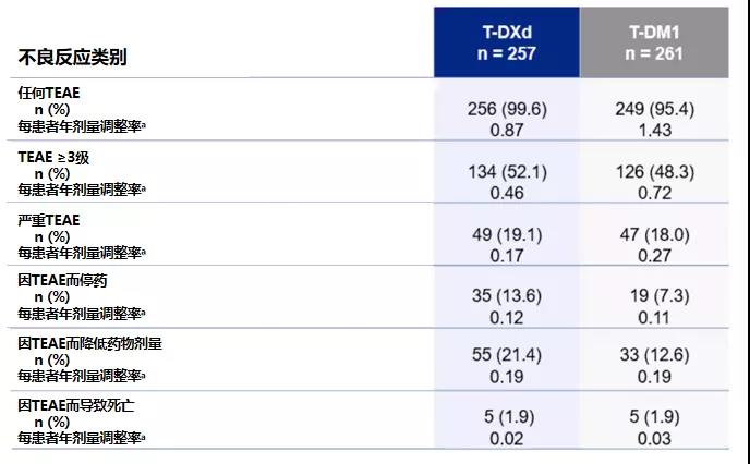T-DXd组中位治疗时间为14.3个月(范围,0.7-29.8)T-DM1组为6.9个月(范围,0.7-25.1)。尽管任意TEAE和≥3级的TEAE在两组发生总体类似,在T-DXd组的因不良反应剂量调整率(EAIR)比T-DM1组低。尽管因TEAE相关的停药在T-DXd组比T-DM1组发生率高,但做出的剂量调整率两组相近。T-DXd组治疗患者相比T-DM1组展示出了良好的耐受性。