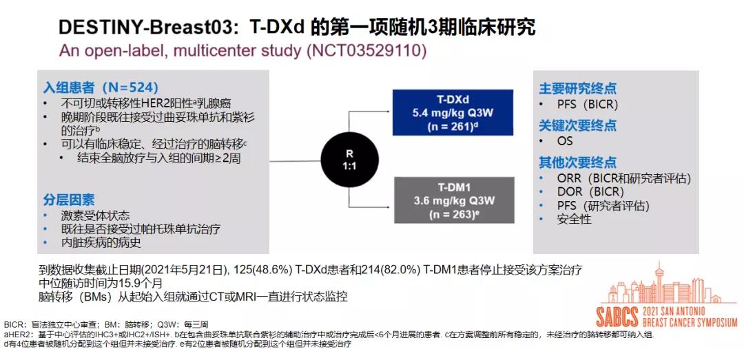 1、Hurvitz S, et al. Trastuzumab deruxtecan (T-DXd; DS-8201a) vs. trastuzumab emtansine (T-DM1) in patients (pts) with HER2+ metastatic breast cancer (mBC): subgroup analyses from the randomized phase 3 study DESTINY-Breast03. 2021 SABCS. GS3-01.